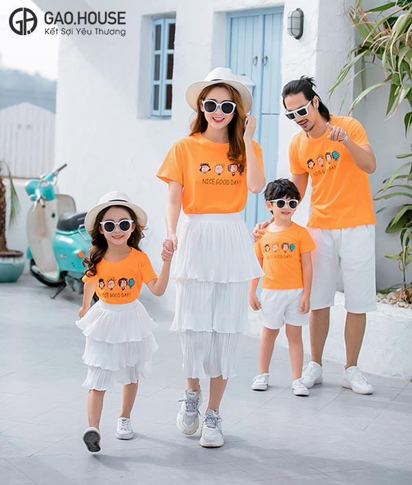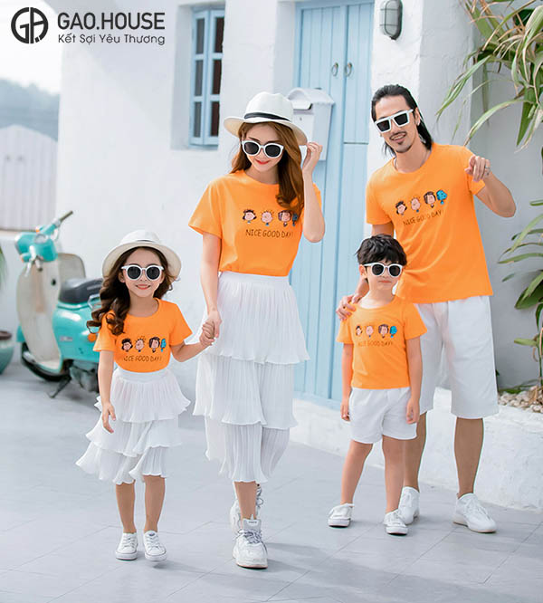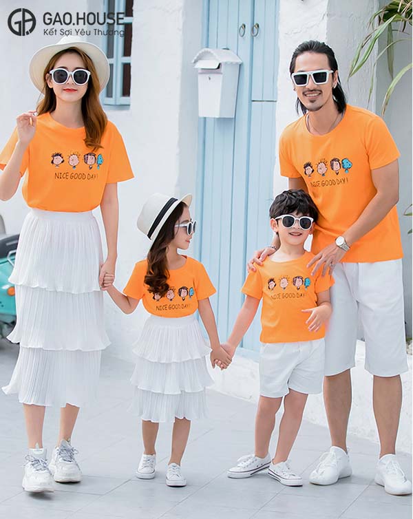 Nice Good Day là item mang sắc cam nổi bật, trên ngực áo là hình chibi các thành viên trong nhà vô cùng ngộ nghĩnh và đáng yêu. Với thiết kế áo gia đình mùa hè cổ tròn trẻ trung và năng động, mẫu áo thun gia đình mùa hè này không chỉ phù hợp với mọi dán người mà hợp với nhiều độ tuổi, giới tính.