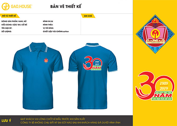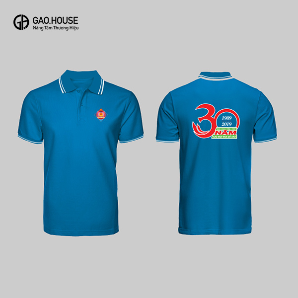 Mẫu đồng phục họp lớp GUH1980034 kỷ niệm 30 năm ngày ra trường 1989-2019 với gam màu xanh dương được thiết kế đơn giản. Dáng áo cổ bẻ, ngắn tay, có hình in nổi bật bên ngực trái và sau lưng với những nét vẽ uyển chuyển, vô cùng tinh tế. Phần cổ áo và bo tay cũng tạo được điểm nhấn đặc biệt nhờ đường le màu trắng nổi bật.
